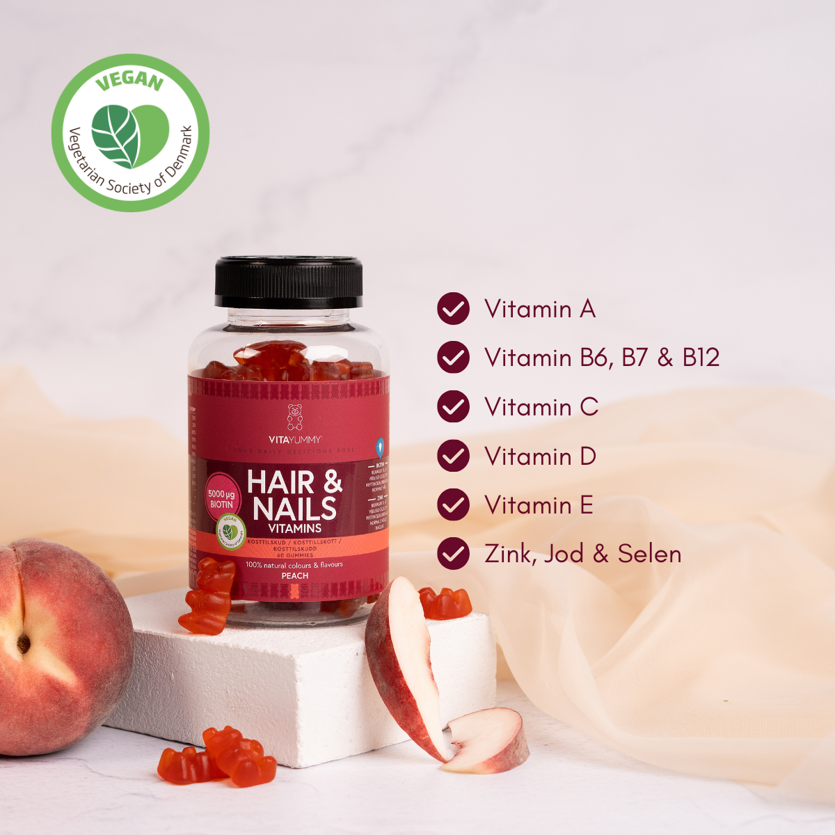 Vill du ha vackert hår och vackra naglar? VitaYummy Hair and nails är goda vingummivitaminer som skämmer bort hår och naglar från insidan. VitaYummy Hair & Nails innehåller vitaminerna A, B (B5, B6, B12 och biotin), C, D, E samt mineralerna zink och jod.