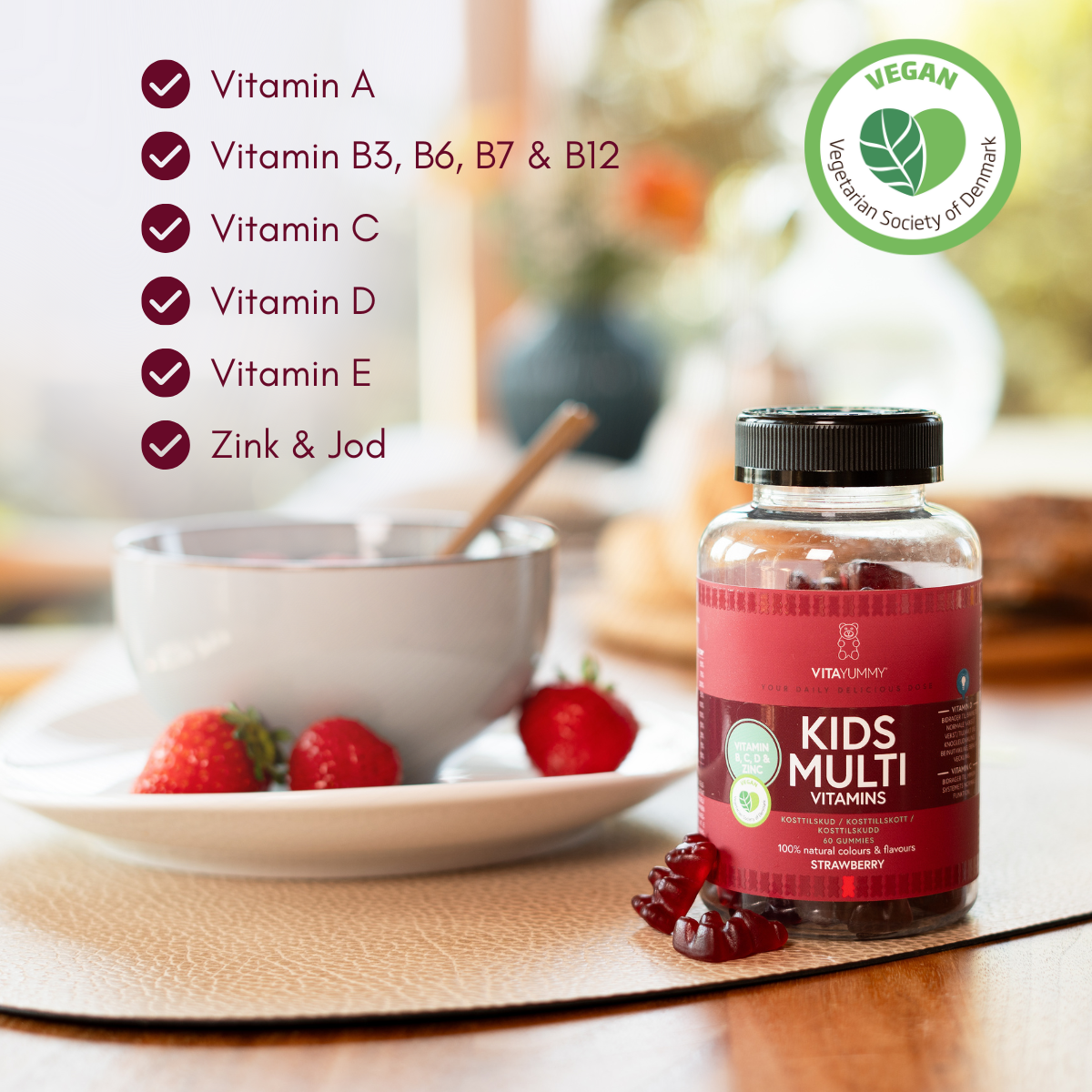 VitaYummy Kids Multivitaminer innehåller ett komplex av vitamin A, flera olika B-vitaminer, vitamin C och D och dessutom mineralerna zink och jod. Sammansättningen bidrar till barnets: Normala tillväxt och benutveckling, normal funktion av immunförsvaret och normal kognitiv funktion.
