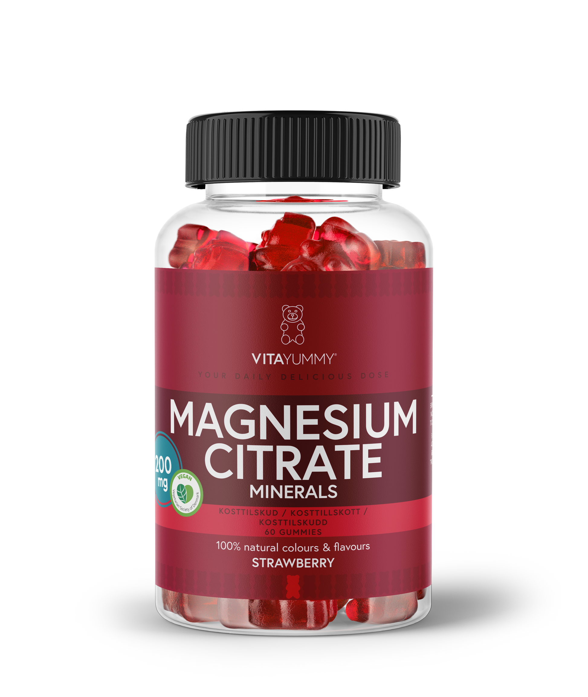 VitaYummy Magnesium Citrate innehåller 200 mg magnesiumcitrat och har en utsökt jordgubbssmak.